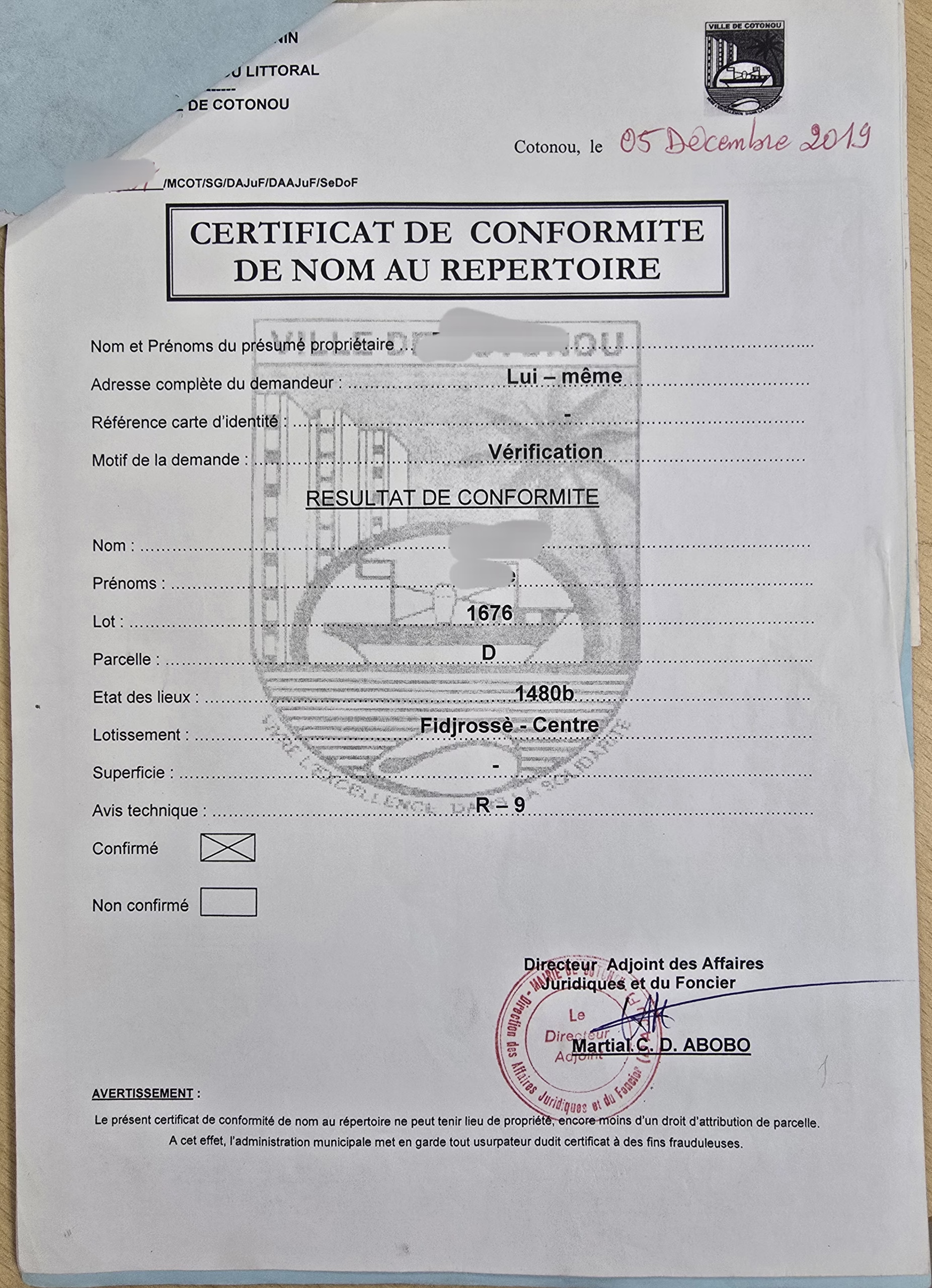 Titre de propriété : TITRE FONCIER PERSONNEL encours – ATTESTATION DE RECASEMENT disponible