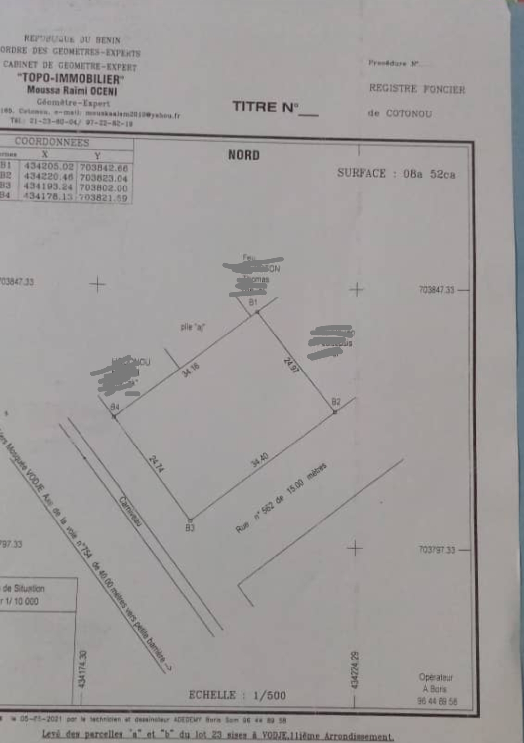 Au bord de la voie 40 pavés vodjè ( Cotonou) et à côté de la pharmacie Ste Foi, une grande parcelle clôturée de 852m² en angle de rue. Elle est située à 400m de l’aéroport de Cotonou dans une zone viabilisée.