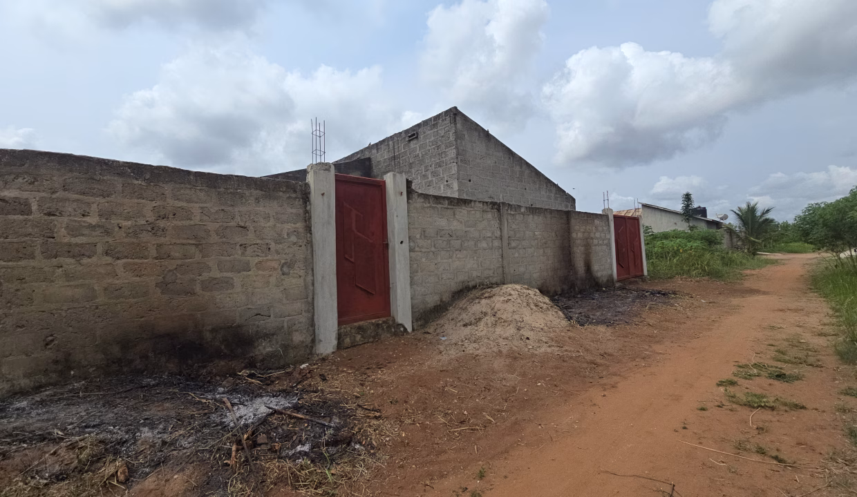 Une maison de 3 chambres salon avec garage de 2 véhicules INACHEVÉE située à Glo Fanmè sur une parcelle de 350m². PS: Chaque chambre avec ses toilettes