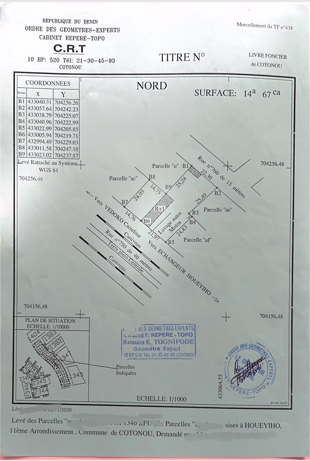 Un domaine de 1467m² situé au bord de la voie 40 goudronnée VEDOKO – HOUÉYIHO avec 2 voies d’accès très idéal pour réaliser de grands projets.