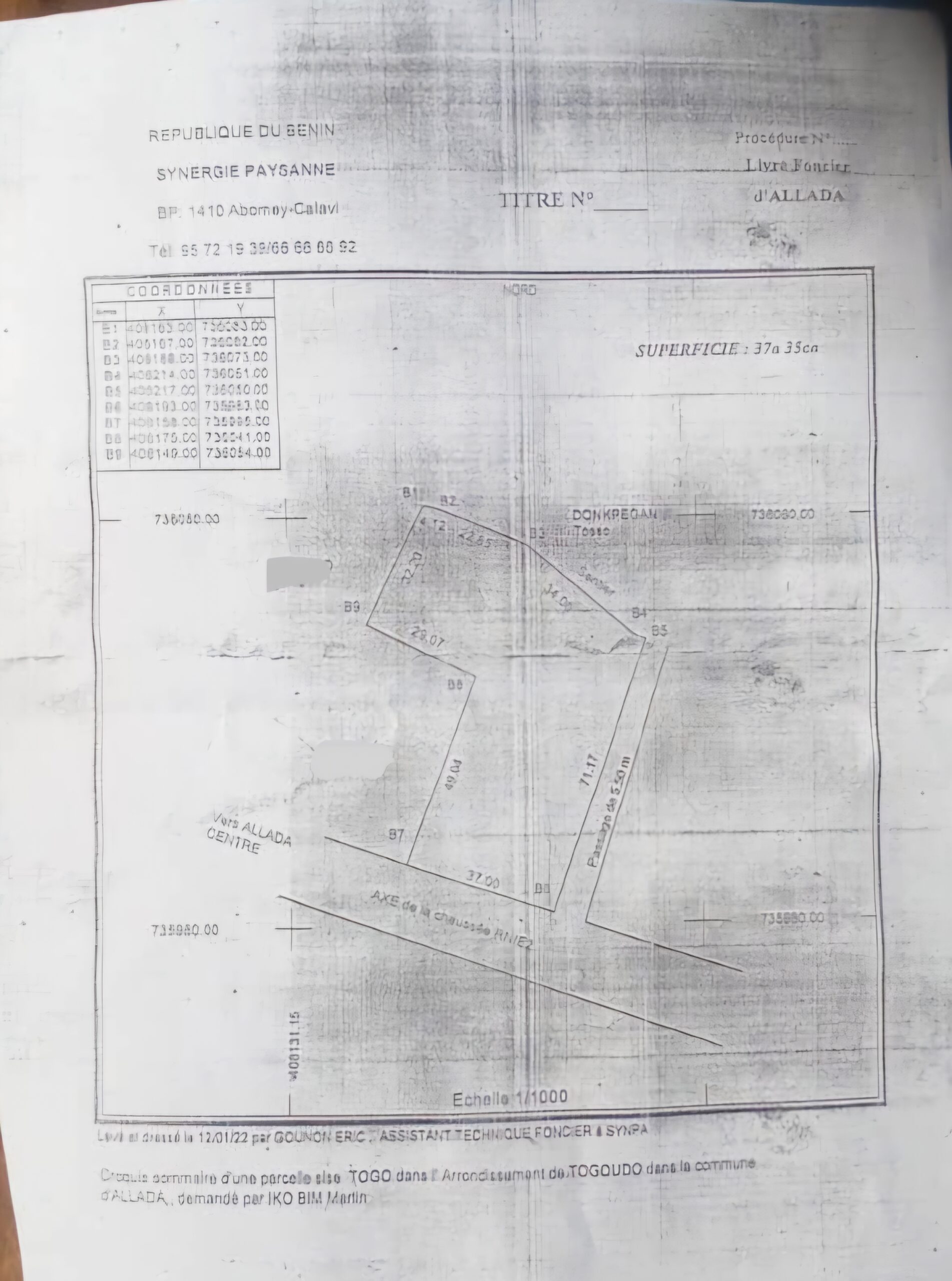 TANK 792 : DOMAINE DE 3735M² À ALLADA AU BORD DE LA ROUTE INTER-ÉTAT GOUDRONNÉE COTONOU-ALLADA 35 MILLIONS TITRE FONCIER PERSONNEL